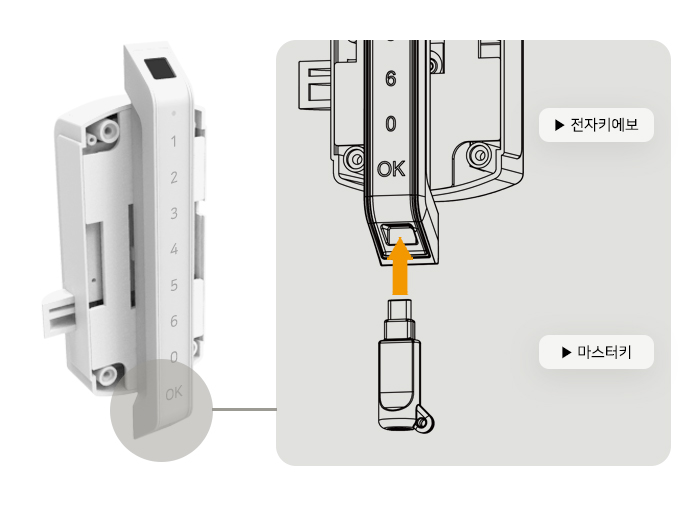 보조배터리 또는 어댑터를 연결한 C타입 케이블을 마스터키 포트에 삽입하면 일시적으로 전원 공급이 가능합니다.